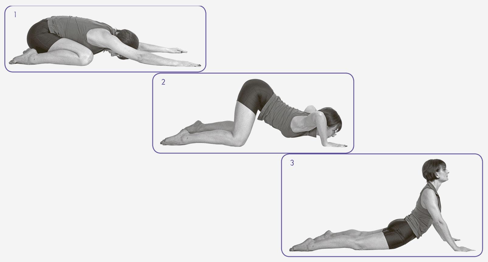 Упражнение «Змея». Лягте на живот и упритесь ладонями в пол под грудью. Медленно выпрямляйте руки, отрывая от пола верхнюю часть спины.