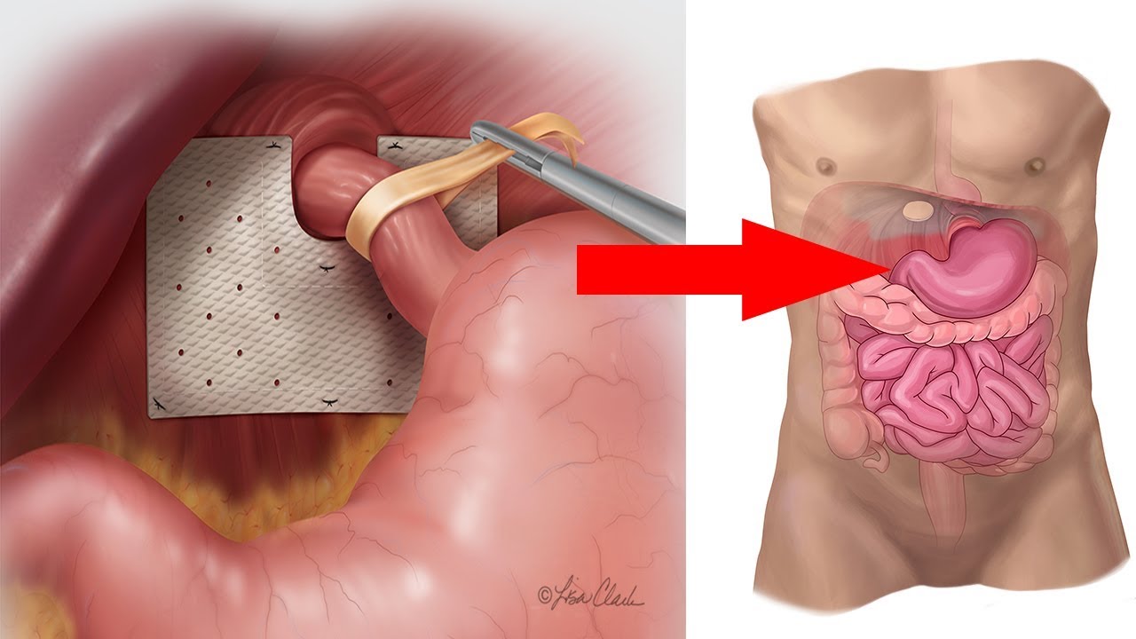 Хирургическое вмешательство сейчас усовершенствовано. Оно делается лапароскопией через несколько проколов брюшной стенки. Врач вставляет желудок на естественное место расположения, оборачивает дно желудка вокруг пищевода на 360° и зашивает. Получается плотное кольцо, которое выглядит как муфта.