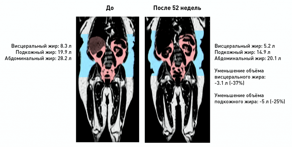 Другой рекордсмен за 52 недели продемонстрировал значительные успехи в борьбе с абдоминальным ожирением: висцерального (внутреннего) жира стало меньше на 37%, брюшного подкожного — на 25%.