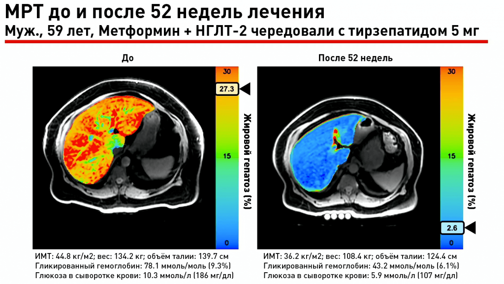 Исследования SURPASS-3 показало значительное снижение содержания жира в печени у взрослых, принимавших Mounjaro, примерно на 8% с начала клинических испытаний. Рекордным стало 25% снижение содержания жировой клетчатки в тканях печени. Результаты МРТ счастливчика, планомерно избавляющегося от жирового гепатоза, представлены ниже.