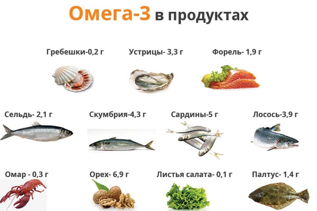 Известный источник Омега-3 — яичные желтки, листья арахиса(свежие), рыбий жир, масло пшеничных зародышей, масло и семена льна, орехи, печень трески, лососевое масло. Незаменимых липидов много в морских продуктах: палтус, моллюски, скумбрия, креветки, тунец, палтус, анчоус, сельдь, лосось, семга и других. Однако хочется отметить, что весьма проблематично удовлетворить суточную потребность липидов с помощью пищи, поэтому иногда лучше взять дозированные препараты на основе жира. Не стоит забывать, что рыба, выращенная в искусственных условиях, к сожалению, лишена Омега-3. Она не употребляет природные компоненты, где присутствуют жирные кислоты.