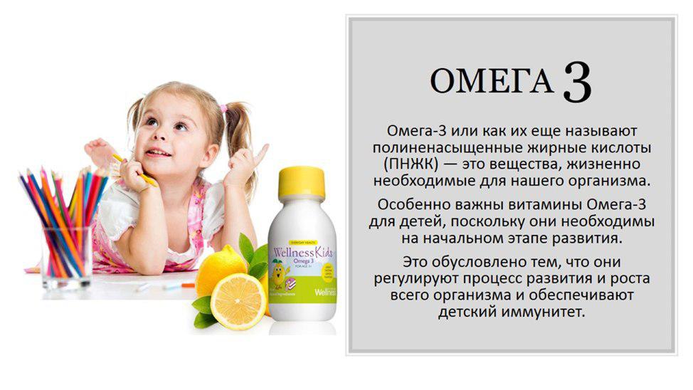 Малышам с первого года жизни важно получение 1 г Омега-3 в день. Нормализовать количество жиров можно с помощью препарата, либо ежедневного употребления морепродуктов, масел, фруктов и других продуктов