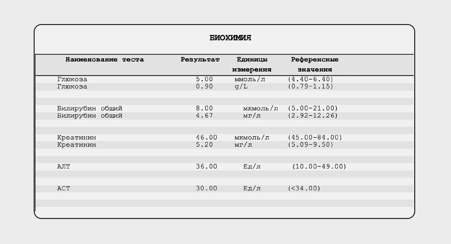 Единицы измерения в анализах тоже могут отличаться в разных клиниках. Поэтому если сравниваете результаты из разных лабораторий, то убедитесь, что они проводили их в одной системе измерений. Иногда значения в справках указывают дважды, в разных единицах измерения, чтобы проще было сопоставлять.