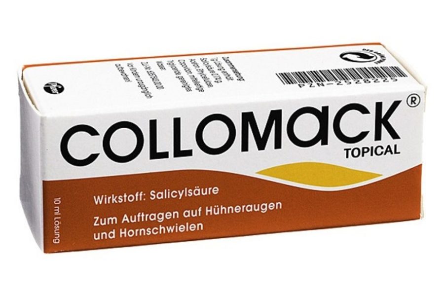 - Колломак – обладает широким спектром действия и может помочь избавиться не только от бородавок разного диаметра, но и от кератом, мозолей и натоптышей. Препарат продается в виде раствора, который наносится на поверхность нароста и взывает омертвление его клеток. В отличие от оксолина, состав Колломака намного быстрее разрушает новообразование, что сокращает курс лечения до одной недели.