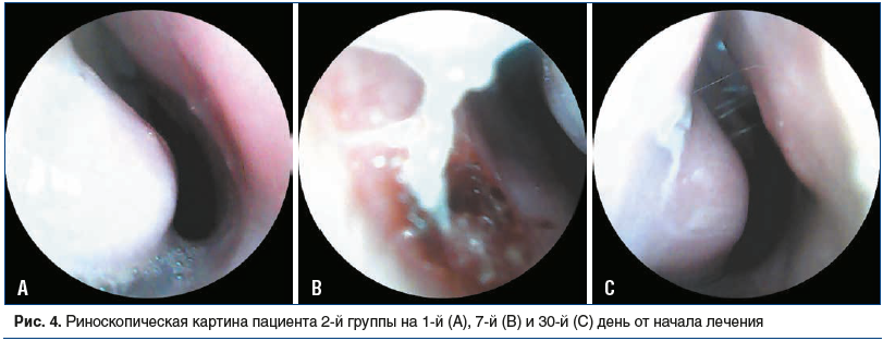 В динамике состояния пациентов и с имптомов ринита в обеих группах на 7-й день от начала лечения отмечено улучшение: все пациенты 1-й группы и 34 (85%) пациента 2-й группы указали на выздоровление, 6 (15%) пациентов 2-й группы отметили улучшение. Однако лишь в 1-й группе статистически значимо (р<0,05) меньше (по частоте выявления и по выраженности) беспокоили такие симптомы, как сухость слизистой оболочки полости носа, корки в полости носа и особенно сукровичное отделяемое в полости носа, что говорит о более благоприятном состоянии слизистой оболочки полости носа (рис. 3, 4). Напомним, что согласно инструкции по применению препарата Олифрин одним из показаний к его применению является повышенная кровоточивость вследствие истончения и сухости слизистой оболочки полости носа.