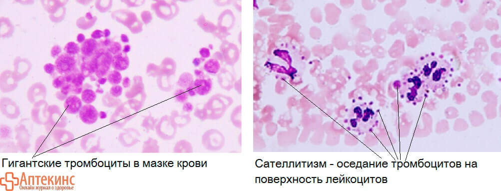 1. Много гигантских макротромбоцитов в мазке – их геманализатор считает, как эритроциты
