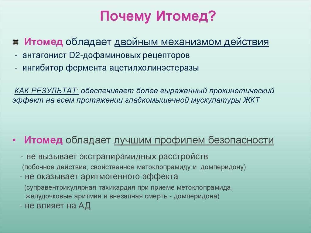 Оптимальное соотношение эффективности и безопасности отмечено у препаратов, имеющих в своем составе итоприд или домперидон. Препараты на базе метоклопрамида имеют много отрицательных побочных эффектов.