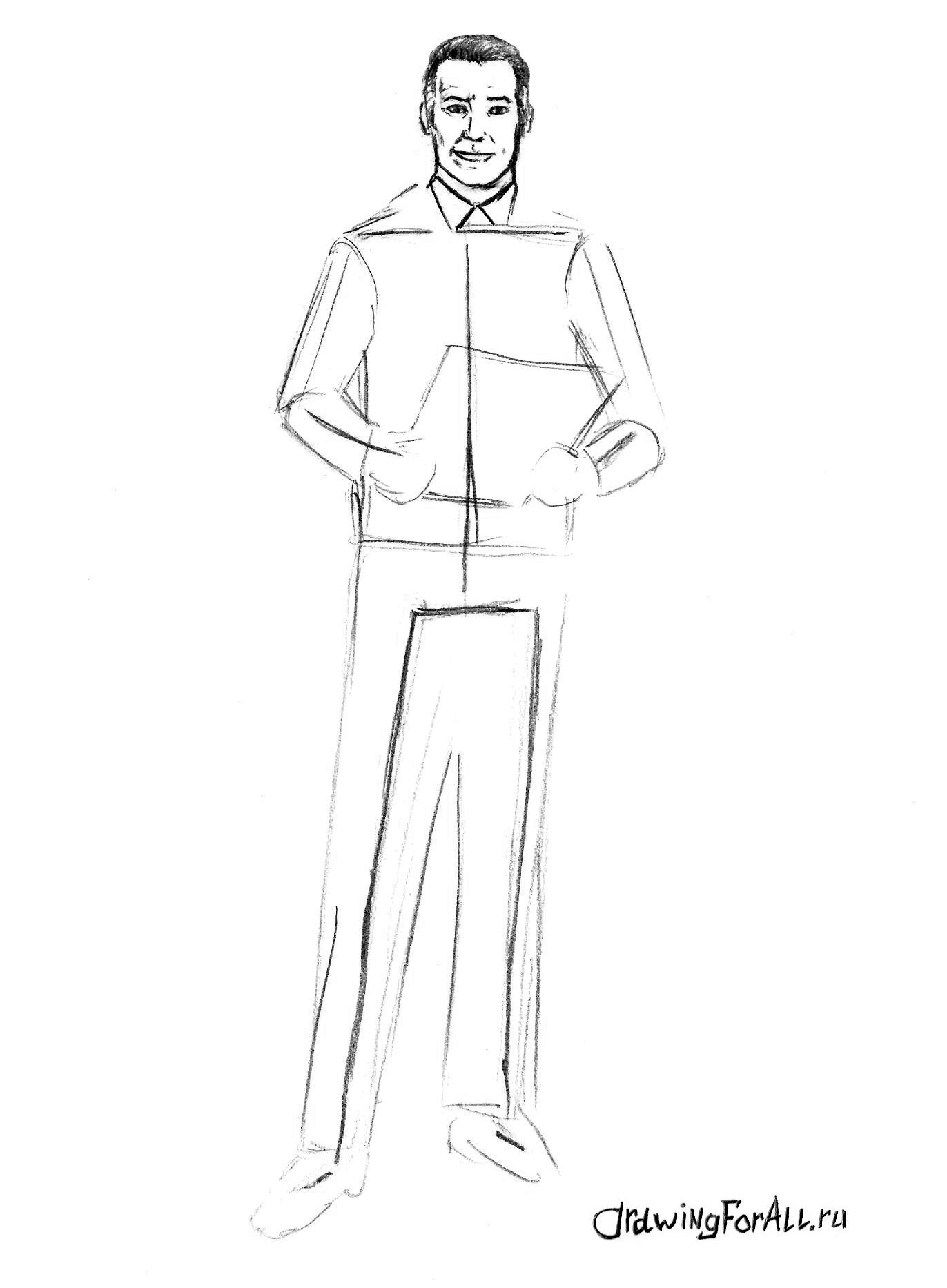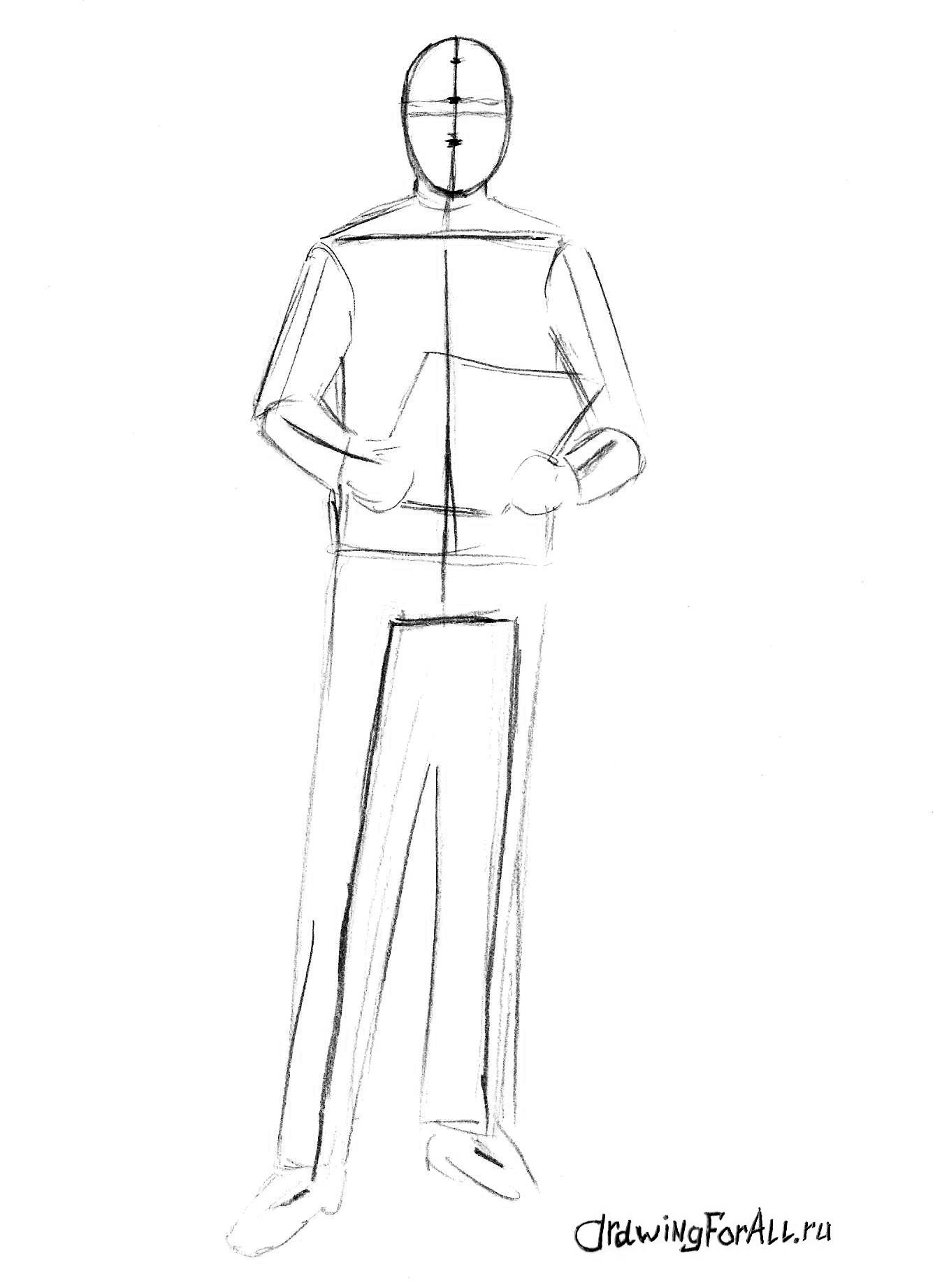 В таком рисунке очень важны пропорции тела. Поэтому начинать следует с наброска из овала для головы, прямых вертикальных, горизонтальных и наклонных линий для туловища, плеч, рук и ног. Нужно помнить, у взрослого человека соотношение головы к телу равняется – приблизительно 1 к 8.