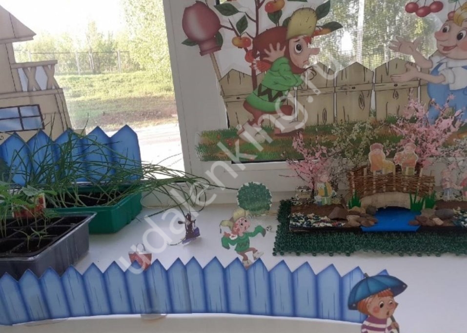 В продолжение темы живых растений, можно создать весеннее украшение группы в детском саду в виде мини-огорода. Поставить на окнах микрозелень, лучок, украсить все это фигурками огородников и заборчиком. Можно привлечь малышей к поливке и ухаживанию за своим мини садом или огородом. Также можно поставить саженцы, а когда сойдет снег, их высадить вместе с детьми на территории д/с.