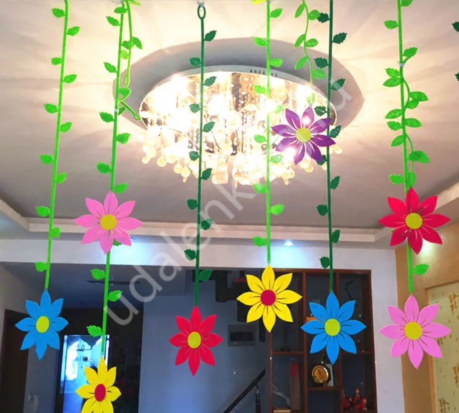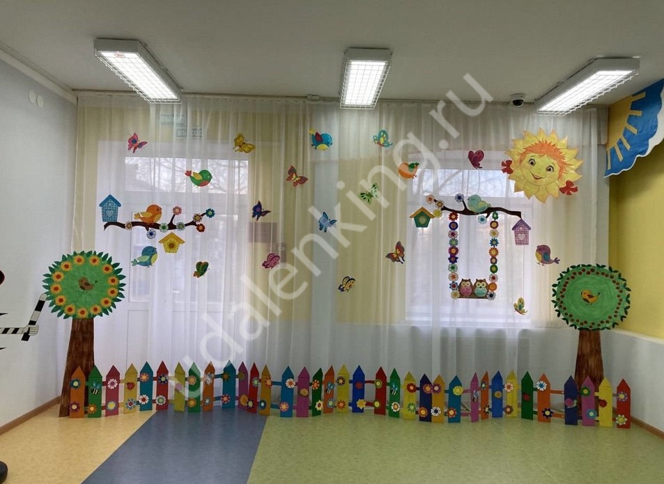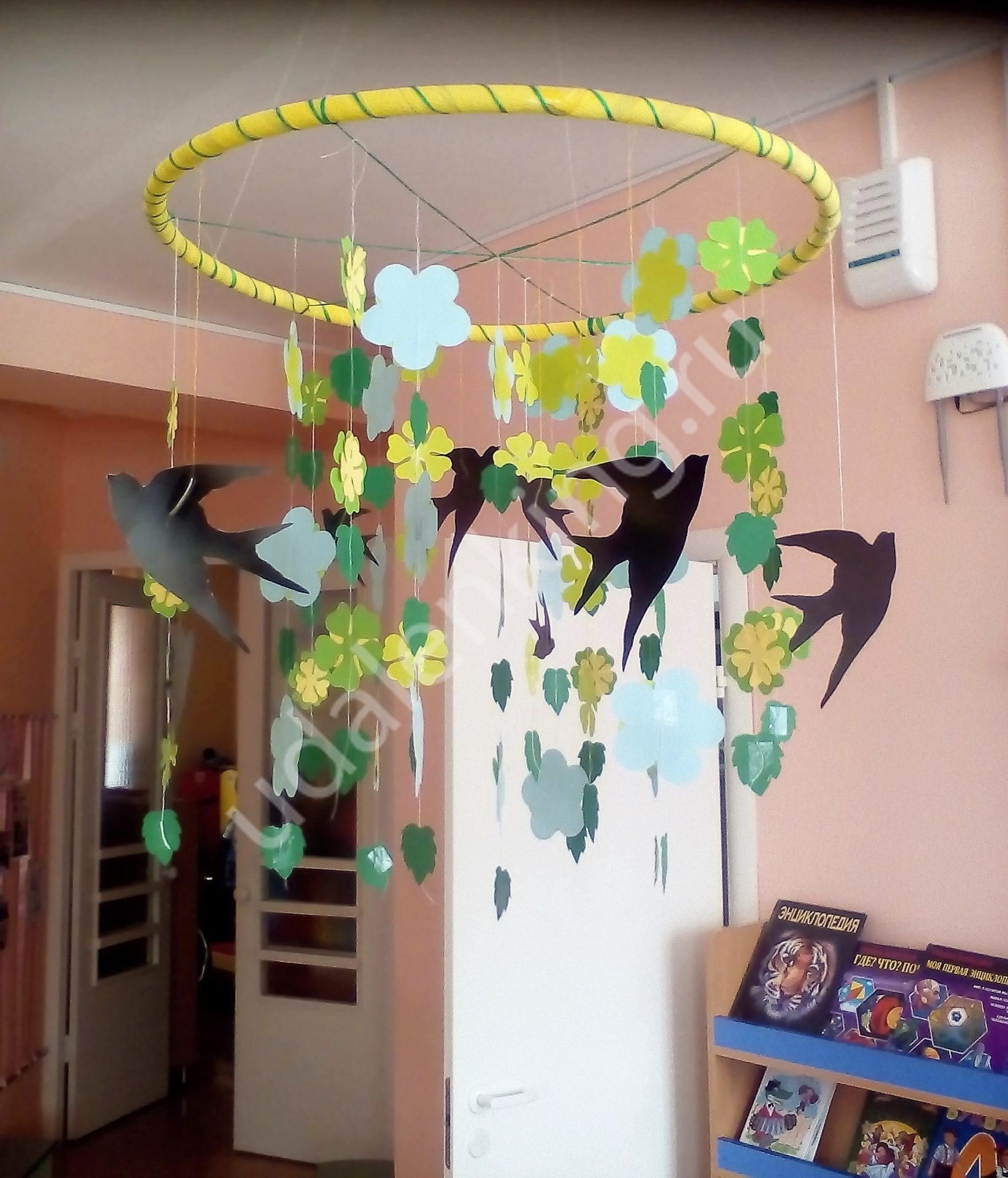 Весенние украшения для детского сада может включать в себя и различные гирлянды. Они могут висеть на окнах, стенах или свисать с потолка. Могут быть различные варианты: цветы, солнышко, бабочки, ласточки