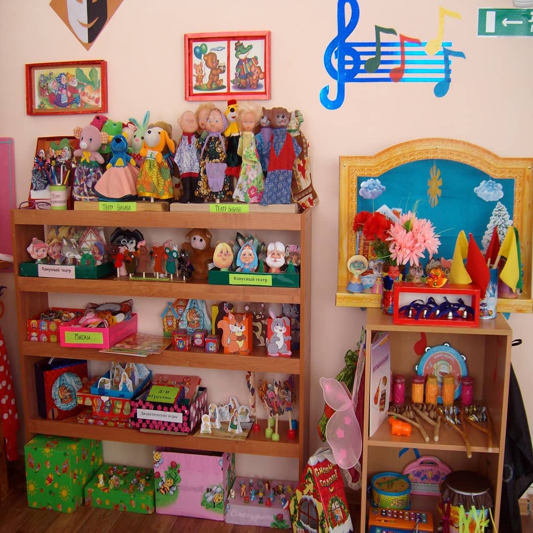 - Театральный уголок. Для проведения различных игр и постановок имеются пальчиковый театр, ширма с занавесом, всевозможные атрибуты для постановки сказок (лес, пеньки, избушка, сказочные персонажи и др.).