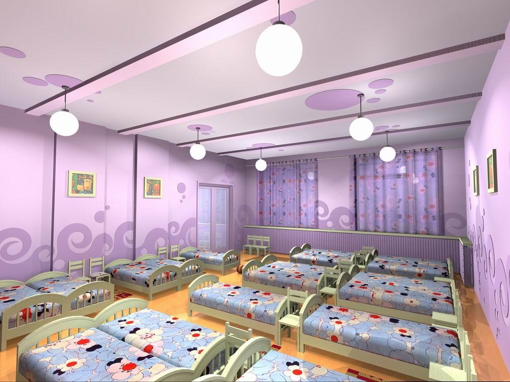 Поскольку дети не особенно любят спать днём, а режим детских садов таков, то нужно максимально приблизить оформление спальни в детском саду к домашней обстановке. Наверное, мало кто может похвастаться, что его ребенок засыпает сразу же, как его положили в кровать. Кому то нужно почитать перед сном сказку, а кто-то любит просто лежать и рассматривать стены или потолок.