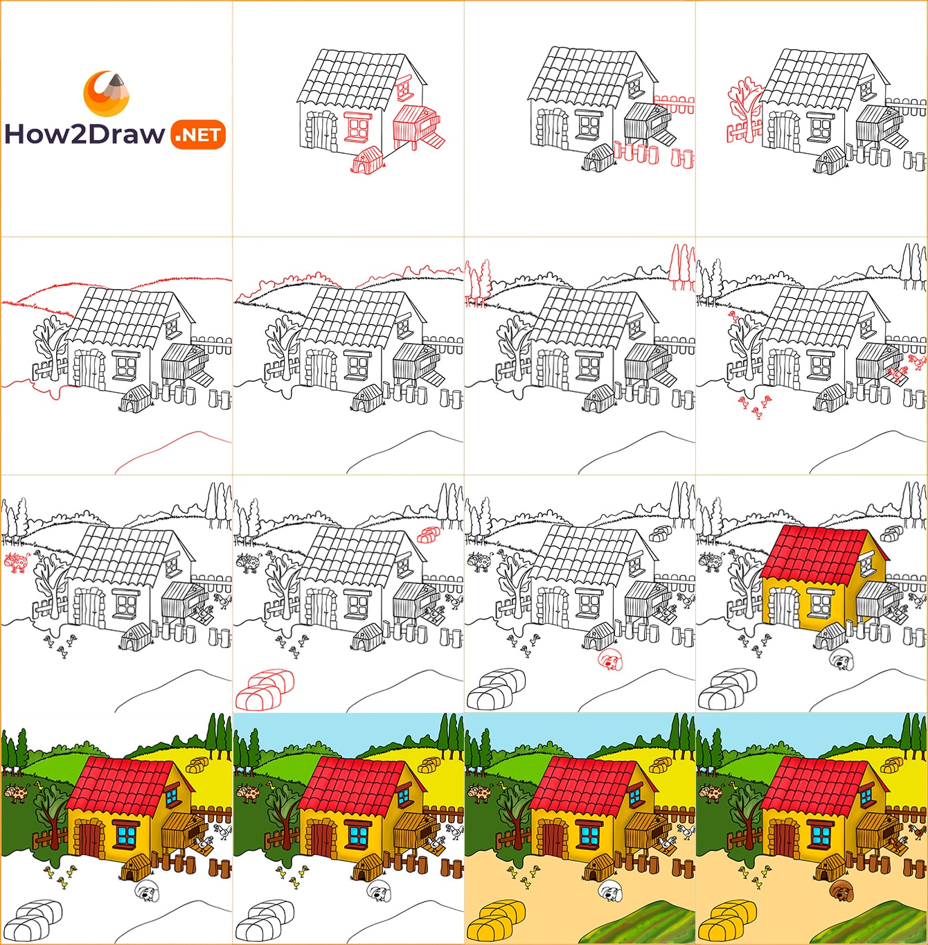 - Набросайте окна, будку, курятник, прилегающий к дому фермера.