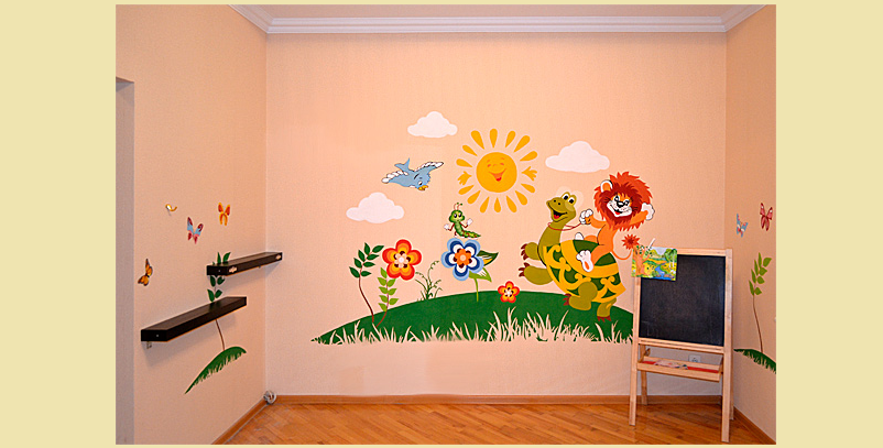 Например, в игровой зоне на стене можно смело нарисовать сюжет из популярного мультфильма.