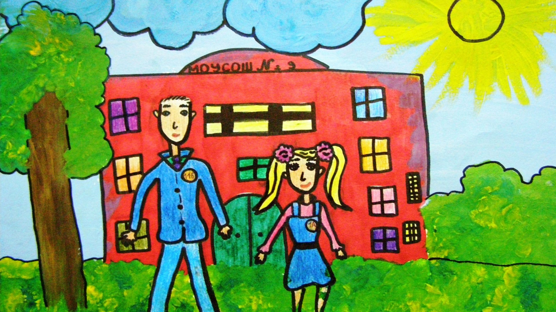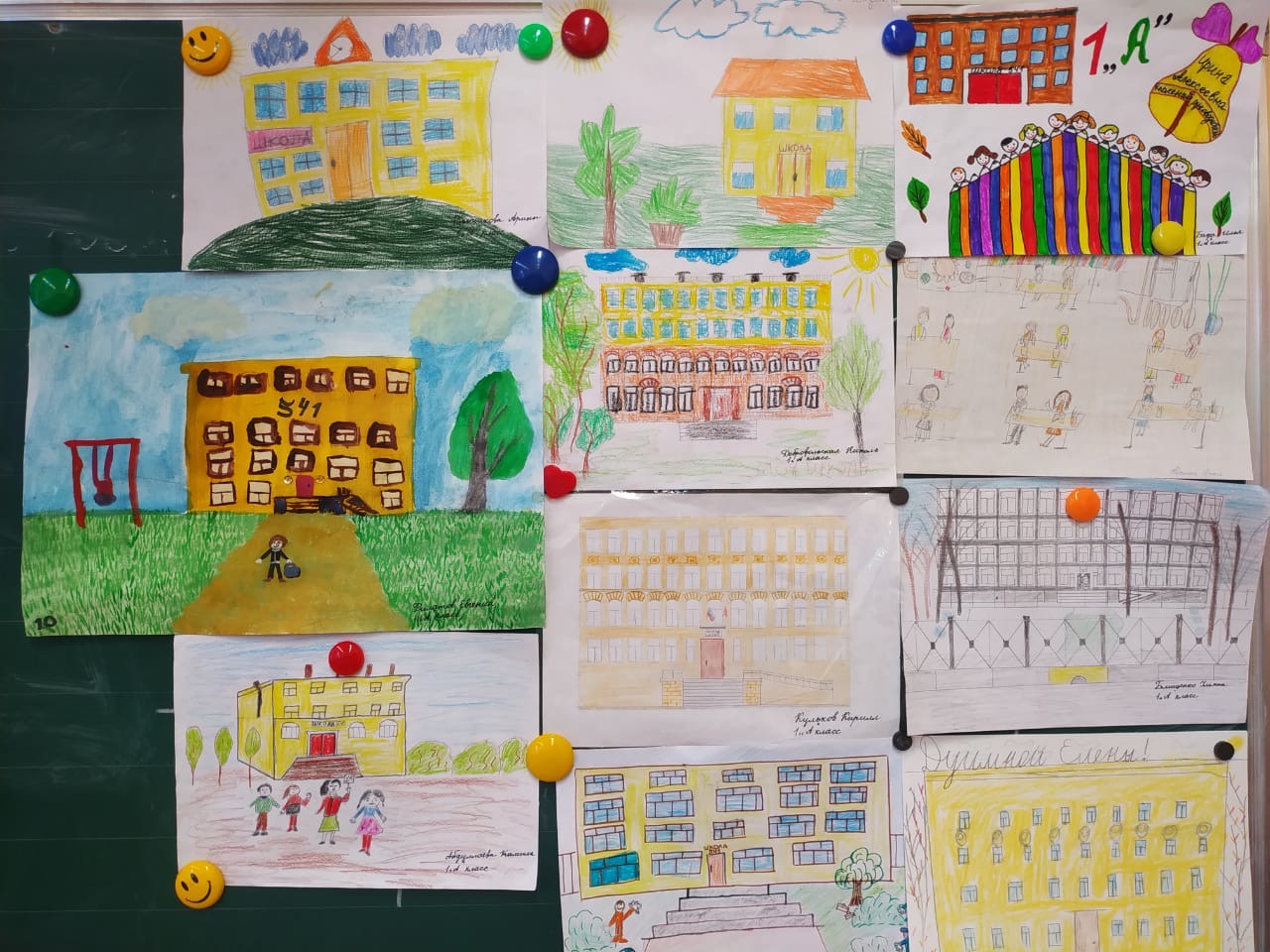 На детских художествах школа выглядит радужно, ярко. Юные школьники позитивно относятся к обучению.