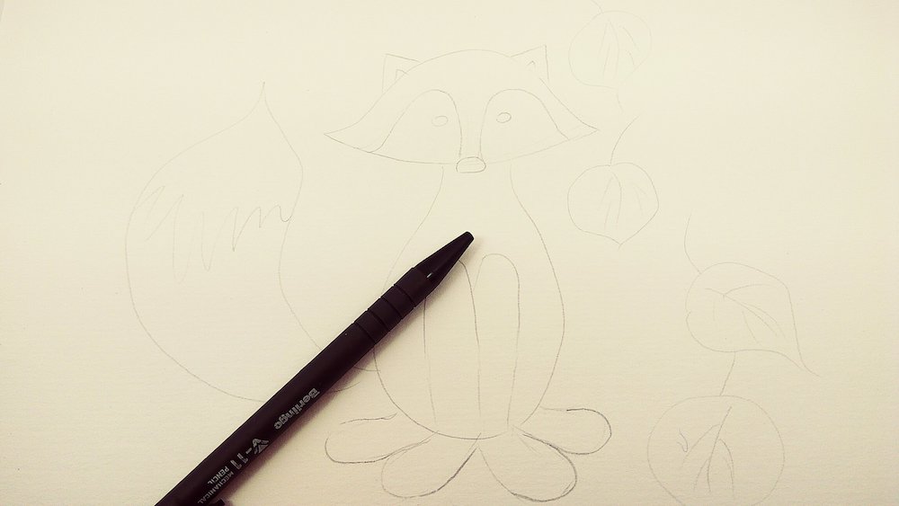 Для начала сделайте на белом листе набросок лисички. Покажите удлиненную широкую мордочку, 4 лапки, пышный хвост. Для того чтобы сделать рисунок осенним, можно показать несколько листиков, падающих на землю.