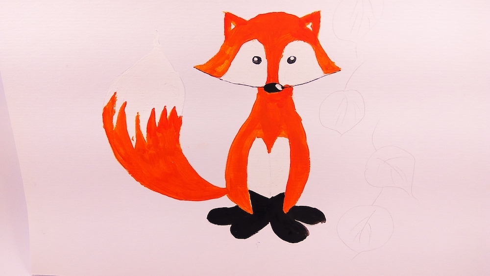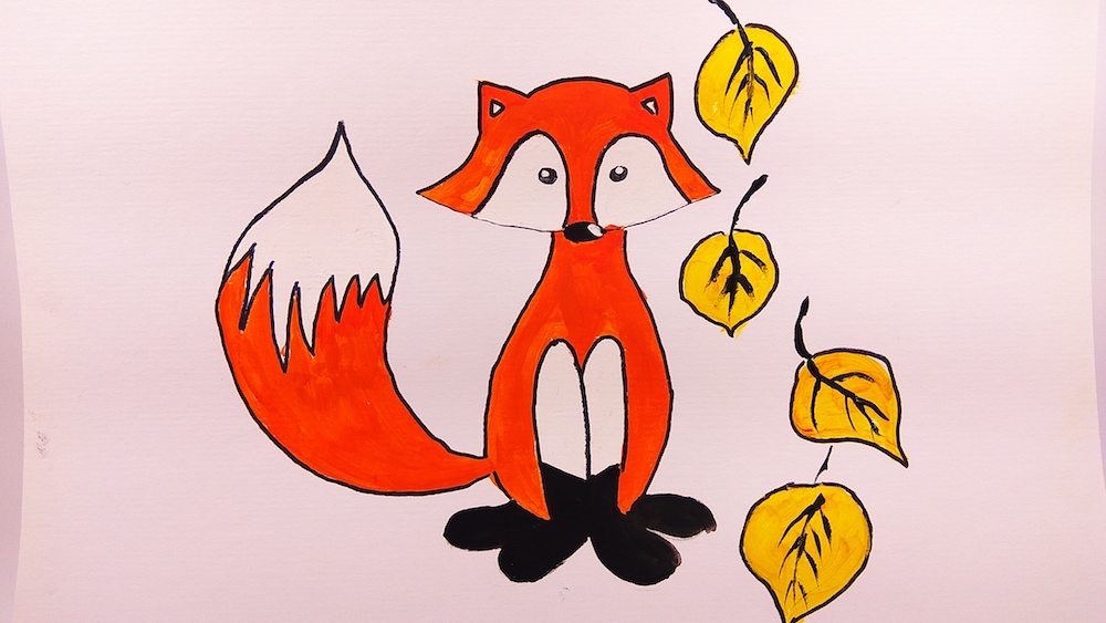 Разрисуйте листики желтой или оранжевой гуашью и покажите прожилки. Напоследок, чтобы сделать рисунок более выразительным, можно выделить все линии на лисичке, а также на листиках. Для этого подойдет тонкая кисточка и черная гуашь либо даже черный фломастер. Последним работать удобнее.