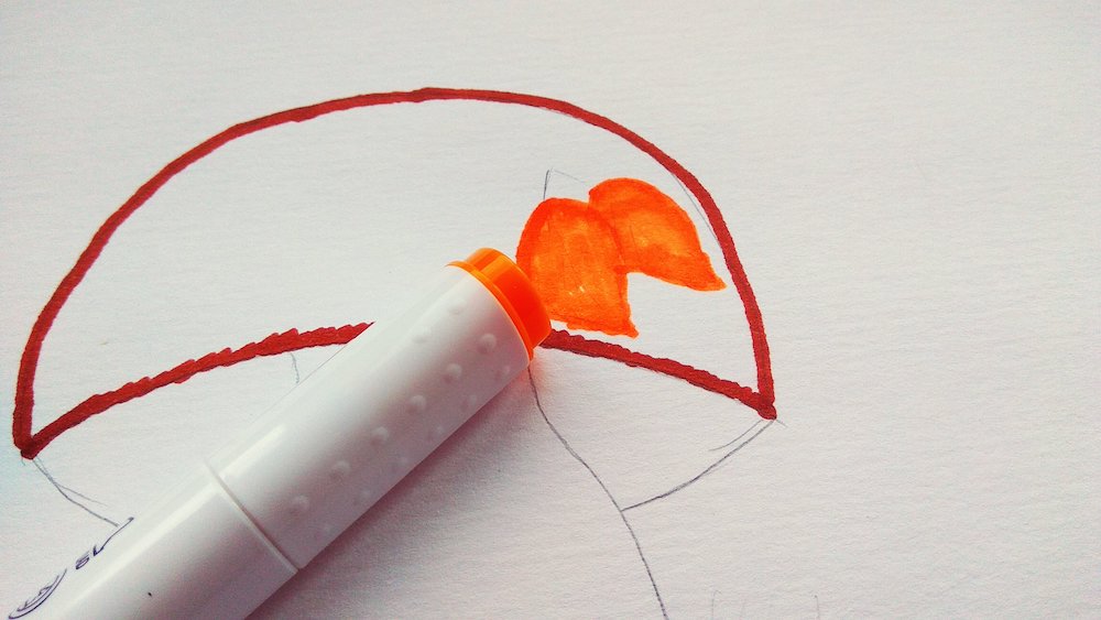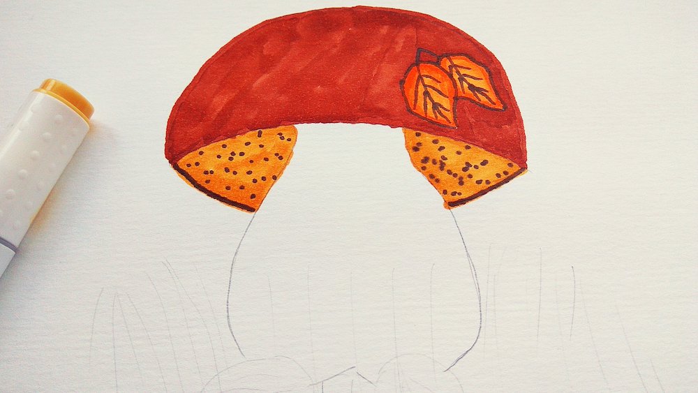 Коричневым фломастером начинайте выделять шляпку гриба. Прорисуйте окантовку штрихами, стараясь не выходить за контуры. Прежде чем заполнять полностью шляпку коричневым пигментом, разрисуйте листики оранжевым или желтым цветом.