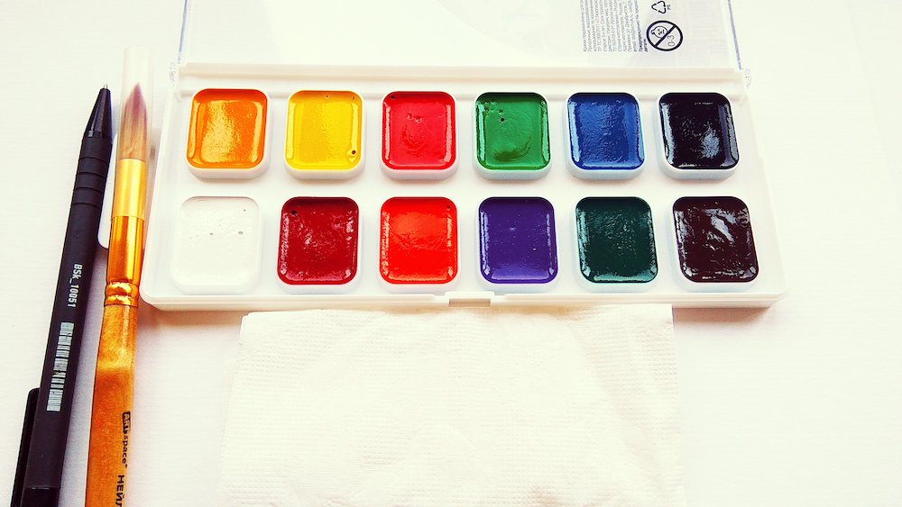 - палетка с акварельными красками;