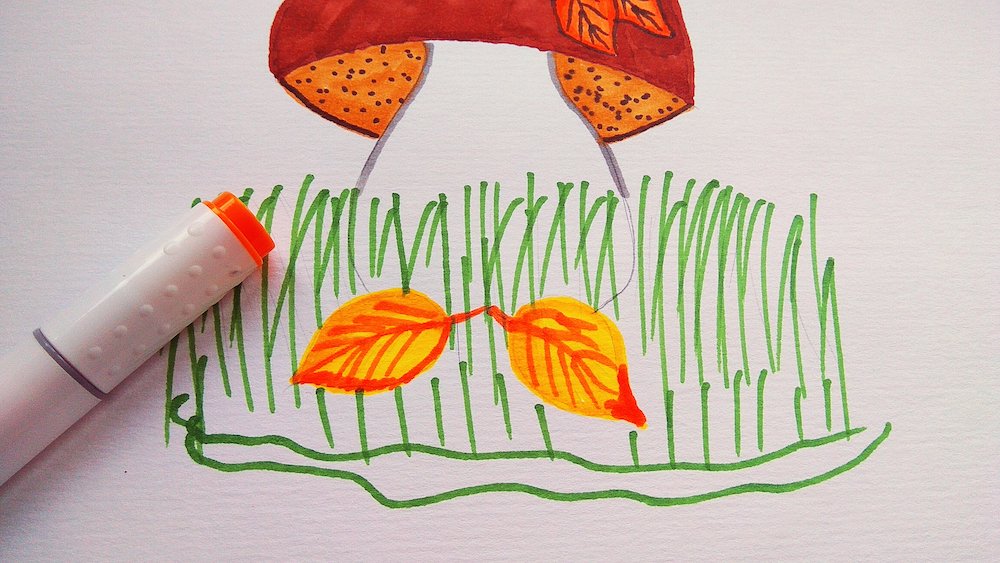 Зеленым пигментом начинайте прорисовывать травинки. Делайте это хаотично, небрежно, но прорисовывайте линии вертикально. Еще не забудьте, что у вас показаны маленькие листики, которые лежат возле грибочка.