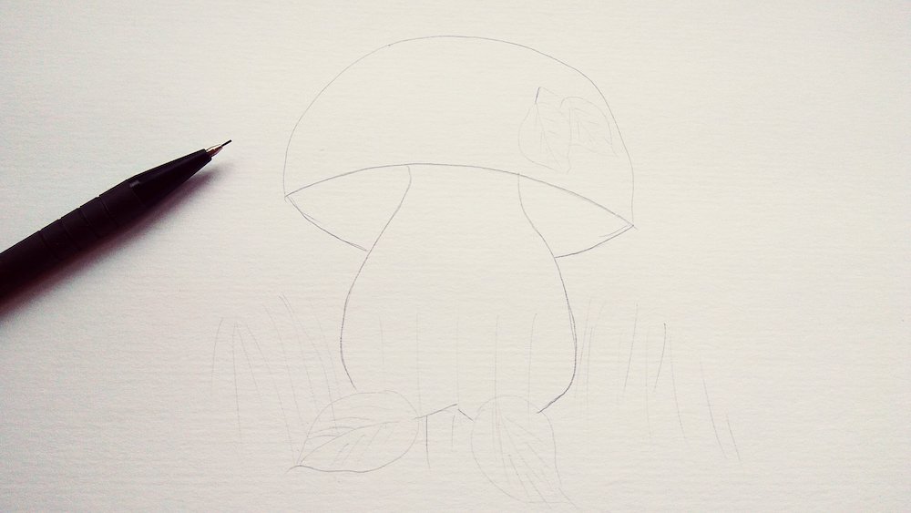 Для начала на плотной бумаге нарисуйте эскиз грибочка. Поскольку планируется именно осенний рисунок, то покажите еще несколько листиков, которые приземлились на шляпку гриба, а также лежат у его подножия. Сразу же покажите травинки, ведь грибы обычно прячутся в густой траве.
