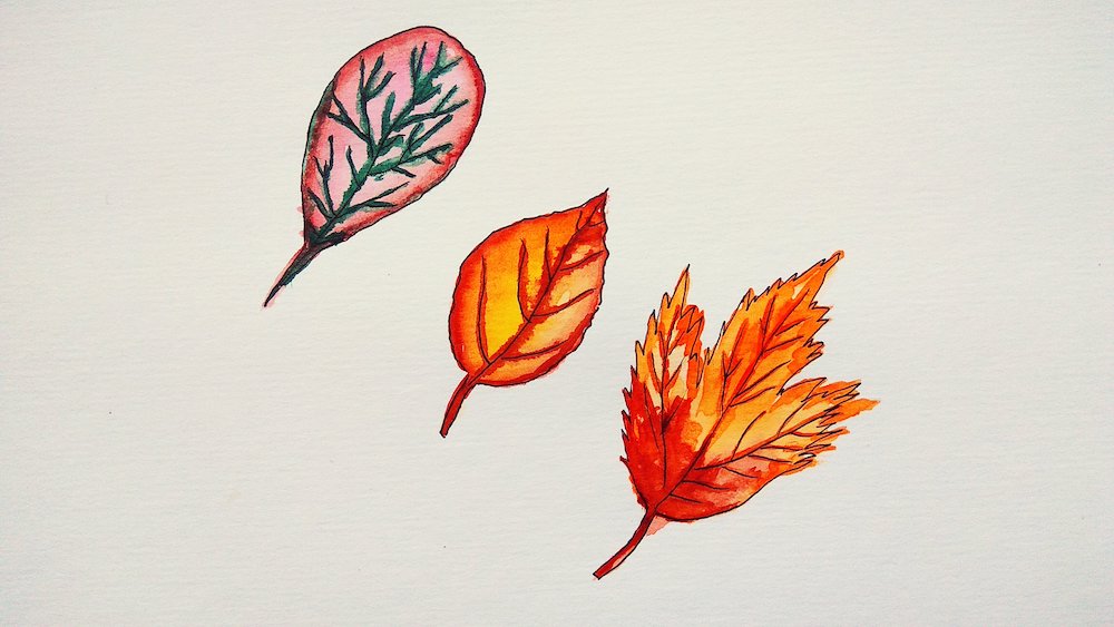 Подготовьте салфетку, чтобы вовремя промокать либо кисточку, либо сам рисунок, если это будет необходимо. Заполните внутреннюю часть листьев: в первом случае красным оттенком, протягивая его внутрь фигуры, во втором случае — желтым, а в третьем — оранжевым или коричневым.