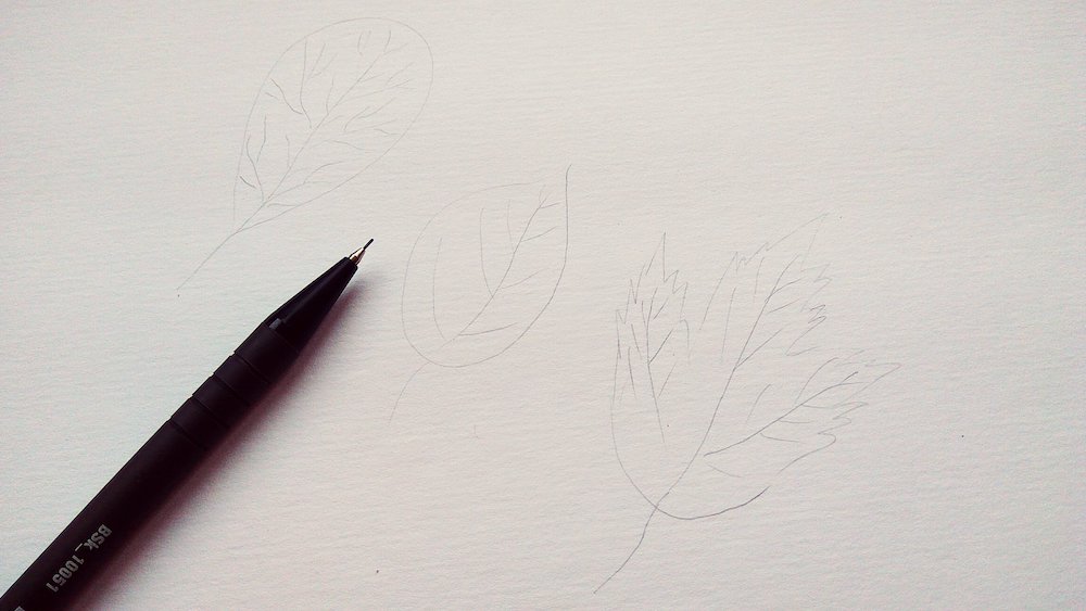 Рекомендуем вам использовать плотную акварельную бумагу. Ее текстура достаточно рыхлая и отлично впитывает воду. Для удобства сразу нанесите легкие эскизы ваших листиков тонким простым карандашом. Их форма может быть абсолютно любой: клен, тополь, береза, каштан, липа, рябина и другие деревья с уникальной кроной. Нарисуйте резные листики или с гладкими краями. Покажите хвостики и прожилки. В дальнейшем нужно заполнять эти рисунки красками.