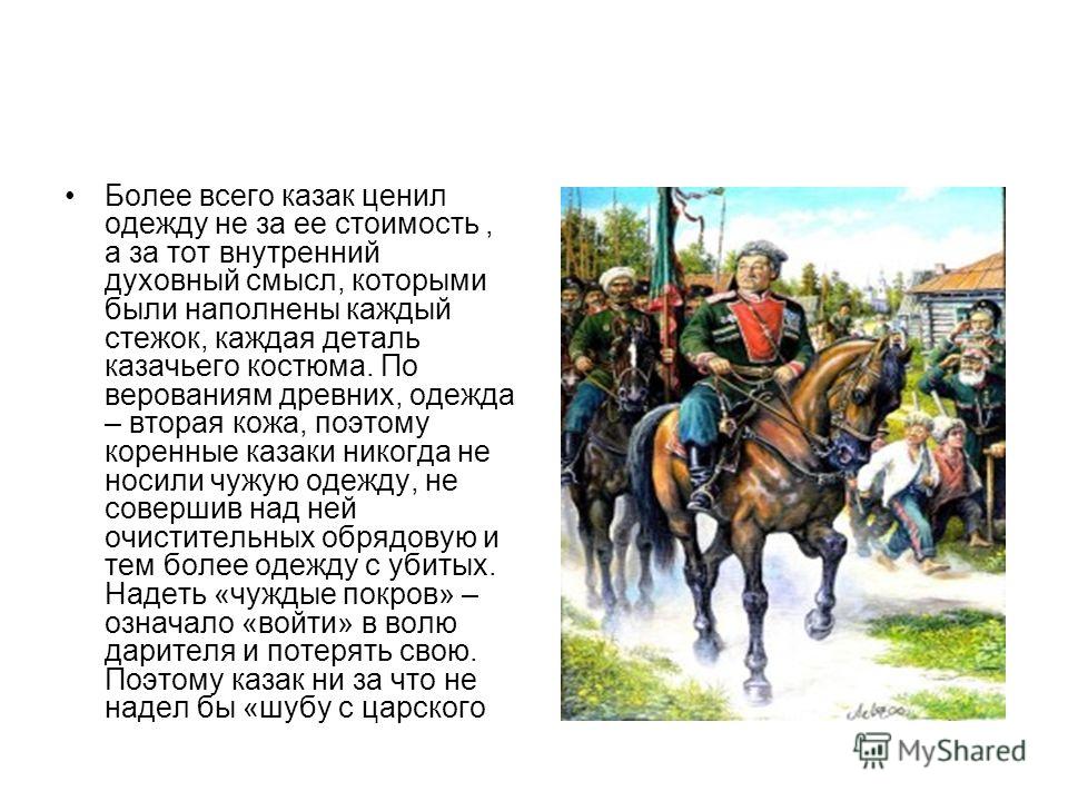 Более всего казак ценил одежду не за ее стоимость, а за тот внутренний духовный смысл, которыми были наполнены каждый стежок, каждая деталь казачьего костюма. По верованиям древних, одежда – вторая кожа, поэтому коренные казаки никогда не носили чужую одежду, не совершив над ней очистительных обрядовую и тем более одежду с убитых. Надеть «чуждые покров» – означало «войти» в волю дарителя и потерять свою. Поэтому казак ни за что не надел бы «шубу с царского