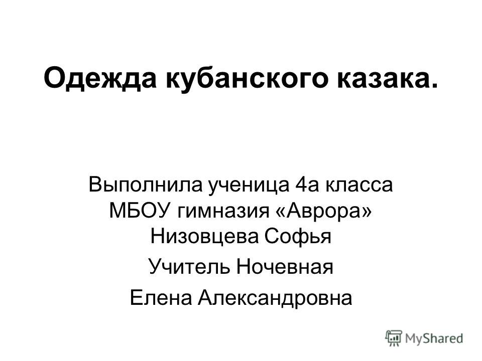 Презентация 4 класса по предмету “МХК, ИЗО, Черчение” на тему: “Одежда кубанского казака. Выполнила ученица 4а класса МБОУ гимназия «Аврора» Низовцева Софья Учитель Ночевная Елена Александровна.”. Скачать бесплатно и без регистрации. — Транскрипт: