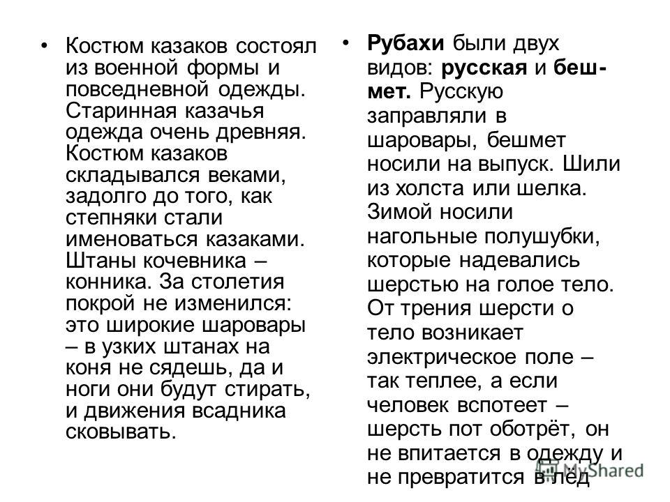 Костюм казаков состоял из военной формы и повседневной одежды. Старинная казачья одежда очень древняя. Костюм казаков складывался веками, задолго до того, как степняки стали именоваться казаками. Штаны кочевника – конника. За столетия покрой не изменился: это широкие шаровары – в узких штанах на коня не сядешь, да и ноги они будут стирать, и движения всадника сковывать. Рубахи были двух видов: русская и беш- мет. Русскую заправляли в шаровары, бешмет носили на выпуск. Шили из холста или шелка. Зимой носили нагольные полушубки, которые надевались шерстью на голое тело. От трения шерсти о тело возникает электрическое поле – так теплее, а если человек вспотеет – шерсть пот оботрёт, он не впитается в одежду и не превратится в лёд