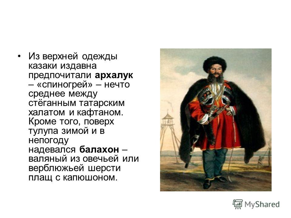 Из верхней одежды казаки издавна предпочитали архалук – «спиногрей» – нечто среднее между стёганным татарским халатом и кафтаном. Кроме того, поверх тулупа зимой и в непогоду надевался балахон – валяный из овечьей или верблюжьей шерсти плащ с капюшоном.