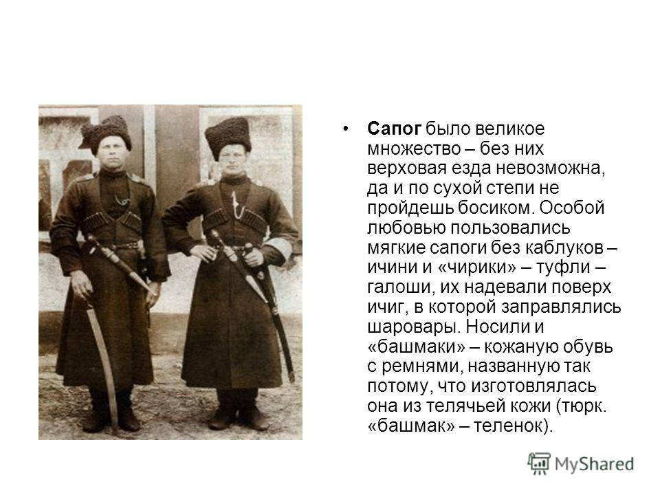 Сапог было великое множество – без них верховая езда невозможна, да и по сухой степи не пройдешь босиком. Особой любовью пользовались мягкие сапоги без каблуков – ичини и «чирики» – туфли – галоши, их надевали поверх ичиг, в которой заправлялись шаровары. Носили и «башмаки» – кожаную обувь с ремнями, названную так потому, что изготовлялась она из телячьей кожи (тюрк. «башмак» – теленок).