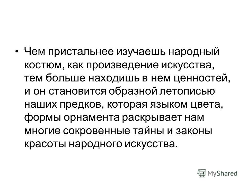 Чем пристальнее изучаешь народный костюм, как произведение искусства, тем больше находишь в нем ценностей, и он становится образной летописью наших предков, которая языком цвета, формы орнамента раскрывает нам многие сокровенные тайны и законы красоты народного искусства.