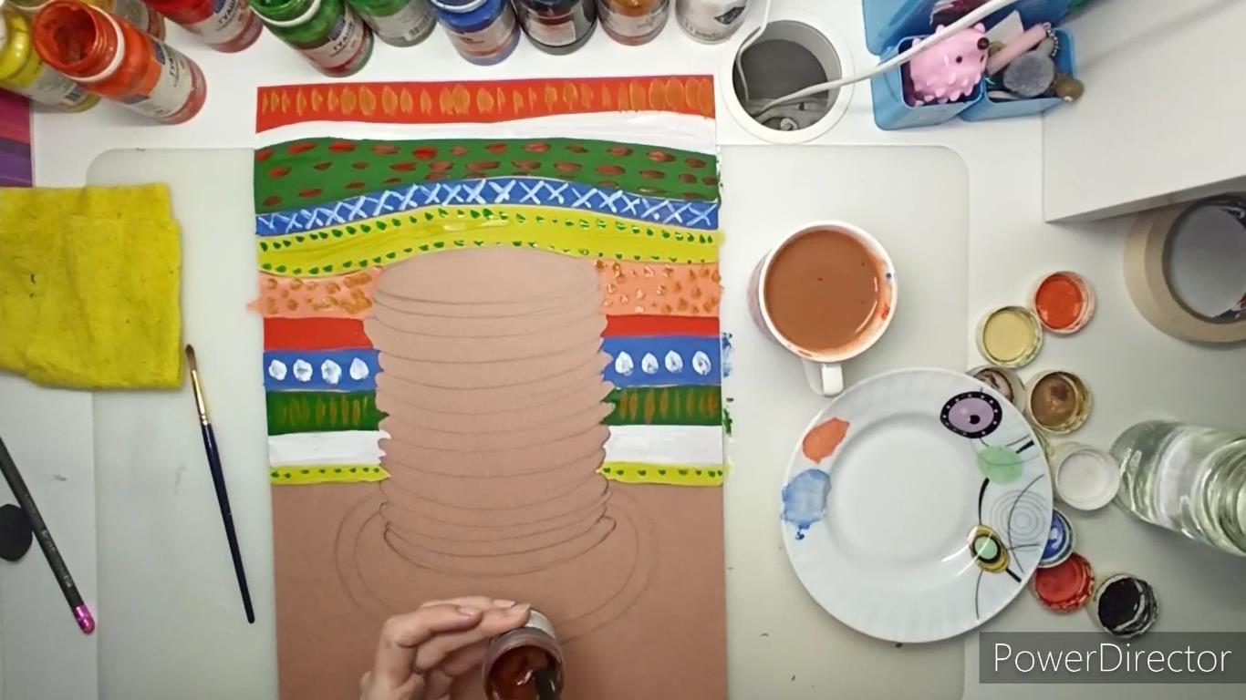 Приступаем к заполнению цветом. Начинаем с заднего фона, получившиеся полоски раскрашиваем в яркие цвета, аккуратно обходя стопку. Некоторые из них украшаем контрастным орнаментом: крестиками, кружочками, точками, полосками.