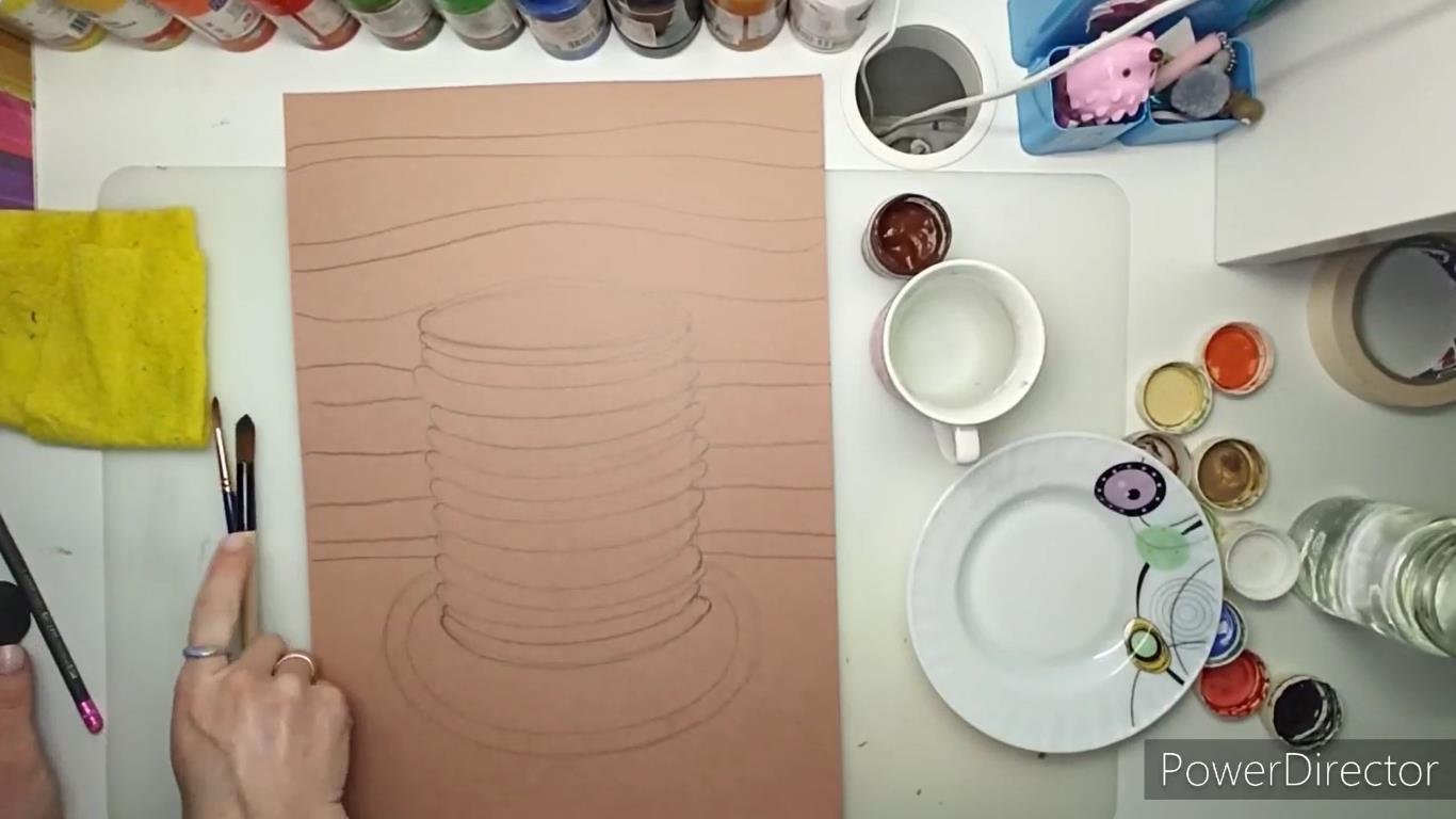 Стираем лишние пометки на цилиндре. Начинаем прорисовывать горизонтальные полоски блинчиков в стопке, они могут быть неровными и даже разной толщины, ничего страшного ! По краю полукруглыми штрихами выделяем каждый блин. На заднем фоне проводим плавные волнистые линии.