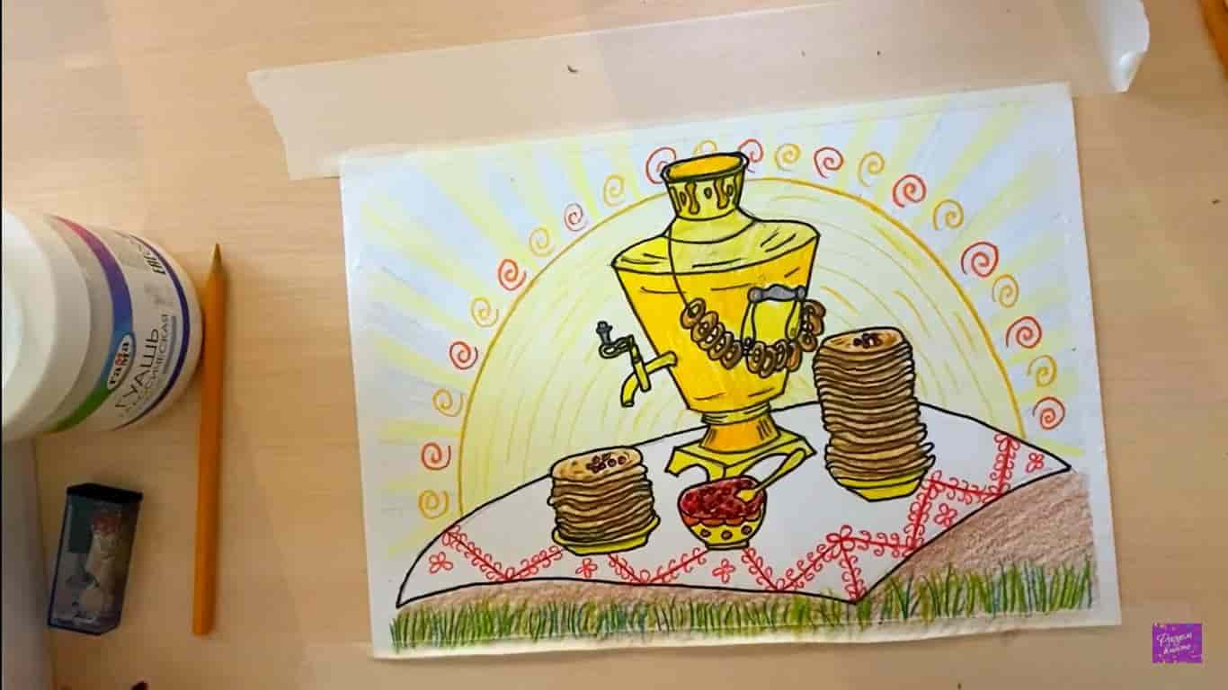 Следуя русским традициям, славянский праздник встречают вместе с пузатым самоваром. Из него так приятно пить горячий чай в первые прохладные весенний дни, а его блестящее пузо очень напоминает золотистое солнышко, не так ли? Поэтому предлагаем юным художникам нарисовать именно его.