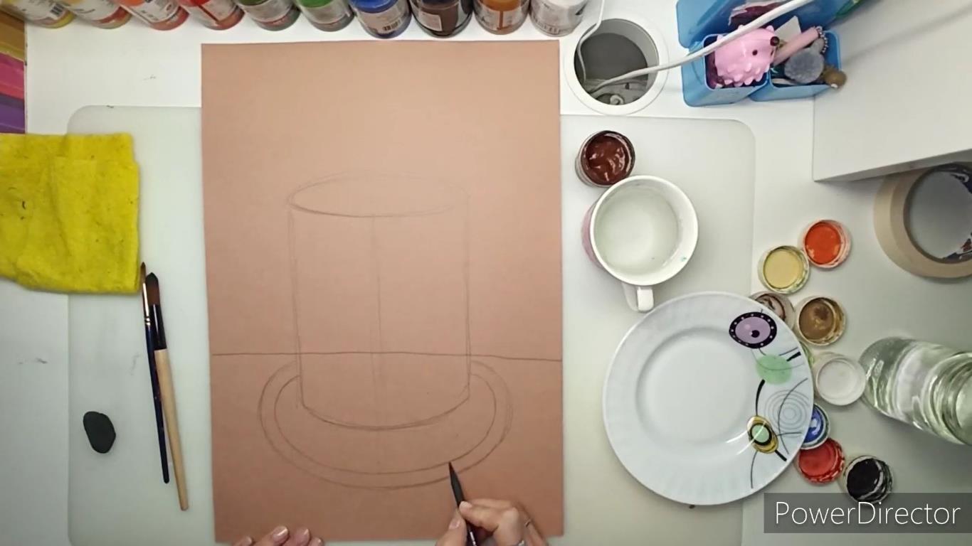 Сделаем вертикальную наметку посередине листа, и горизонтальную, которая будет обозначать край бедующего стола. Намечаем форму цилиндра и тарелки с каемкой чуть ниже.