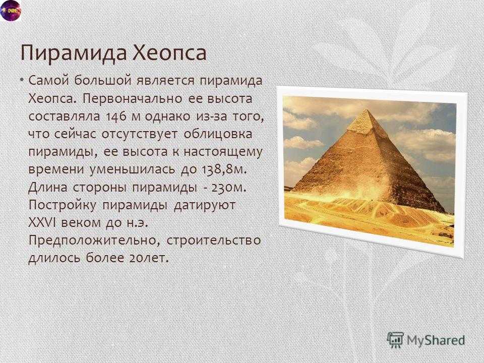 Пирамида Хеопса Самой большой является пирамида Хеопса. Первоначально ее высота составляла 146 м однако из-за того, что сейчас отсутствует облицовка пирамиды, ее высота к настоящему времени уменьшилась до 138,8 м. Длина стороны пирамиды м. Постройку пирамиды датируют XXVI веком до н.э. Предположительно, строительство длилось более 20 лет.