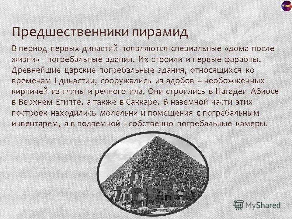 Предшественники пирамид В период первых династий появляются специальные «дома после жизни» — погребальные здания. Их строили и первые фараоны. Древнейшие царские погребальные здания, относящихся ко временам I династии, сооружались из адобов – необожженных кирпичей из глины и речного ила. Они строились в Нагадеи Абиосе в Верхнем Египте, а также в Саккаре. В наземной части этих построек находились молельни и помещения с погребальным инвентарем, а в подземной –собственно погребальные камеры.