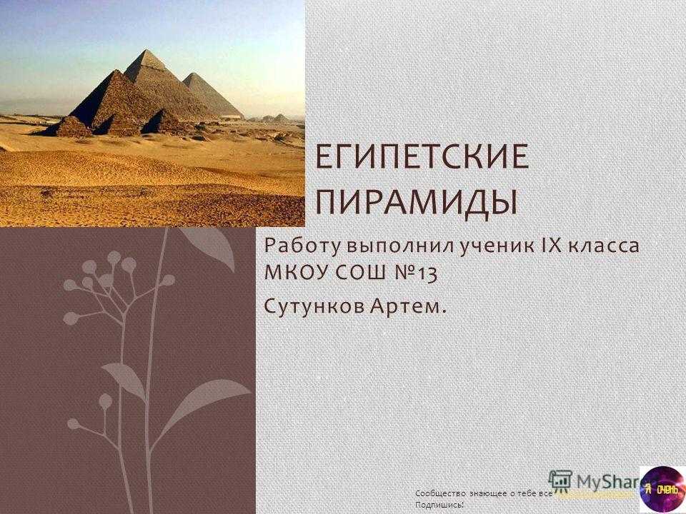 Работу выполнил ученик IX класса МКОУ СОШ 13 Сутунков Артем. ЕГИПЕТСКИЕ ПИРАМИДЫ Сообщество знающее о тебе все Подпишись!