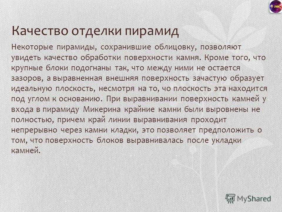 Качество отделки пирамид Некоторые пирамиды, сохранившие облицовку, позволяют увидеть качество обработки поверхности камня. Кроме того, что крупные блоки подогнаны так, что между ними не остается зазоров, а выравненная внешняя поверхность зачастую образует идеальную плоскость, несмотря на то, что плоскость эта находится под углом к основанию. При выравнивании поверхность камней у входа в пирамиду Микерина крайние камни были выровнены не полностью, причем край линии выравнивания проходит непрерывно через камни кладки, это позволяет предположить о том, что поверхность блоков выравнивалась после укладки камней.