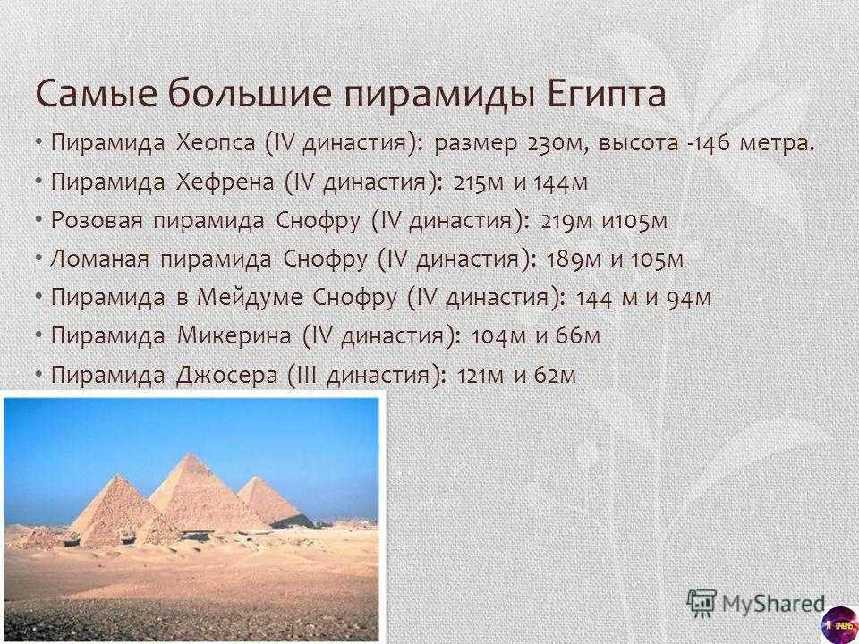 Самые большие пирамиды Египта Пирамида Хеопса (IV династия): размер 230 м, высота -146 метра. Пирамида Хефрена (IV династия): 215 м и 144 м Розовая пирамида Снофру (IV династия): 219 м и 105 м Ломаная пирамида Снофру (IV династия): 189 м и 105 м Пирамида в Мейдуме Снофру (IV династия): 144 м и 94 м Пирамида Микерина (IV династия): 104 м и 66 м Пирамида Джосера (III династия): 121 м и 62 м