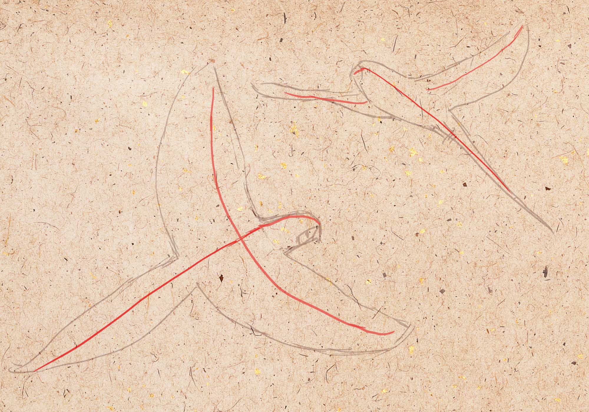 К наброску лапы пририсуйте ещё одну дугу. Получится форма, похожая на тонкий полумесяц, — это коготь. Второй коготь почти не видно — нарисуйте лишь его верхнюю часть и острый кончик. Соедините лапку с телом двумя штрихами.