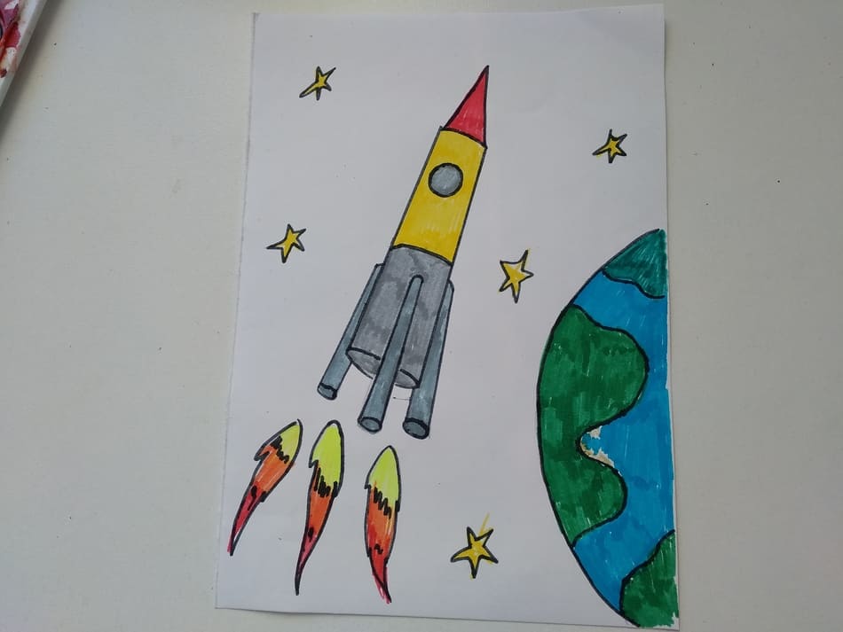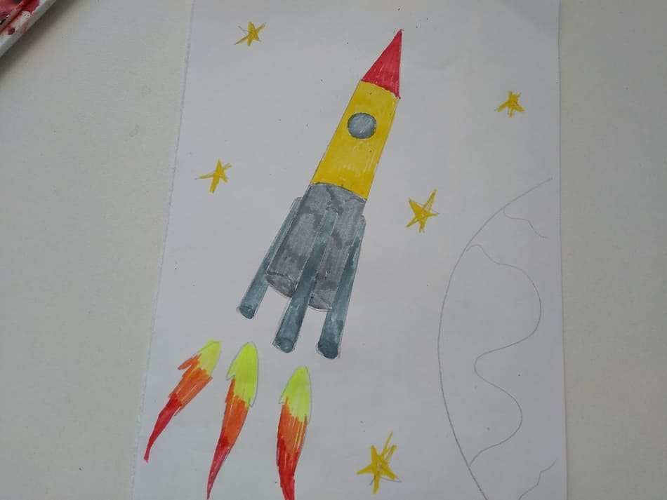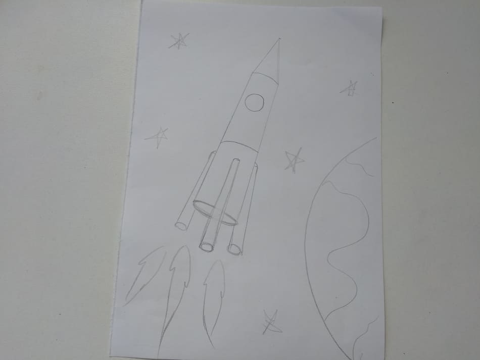 Поскольку основным объектом в космосе является космический корабль, например ракета, вполне целесообразно научить ребенка рисовать один, чтобы подготовить рисунок на тему космоса.
