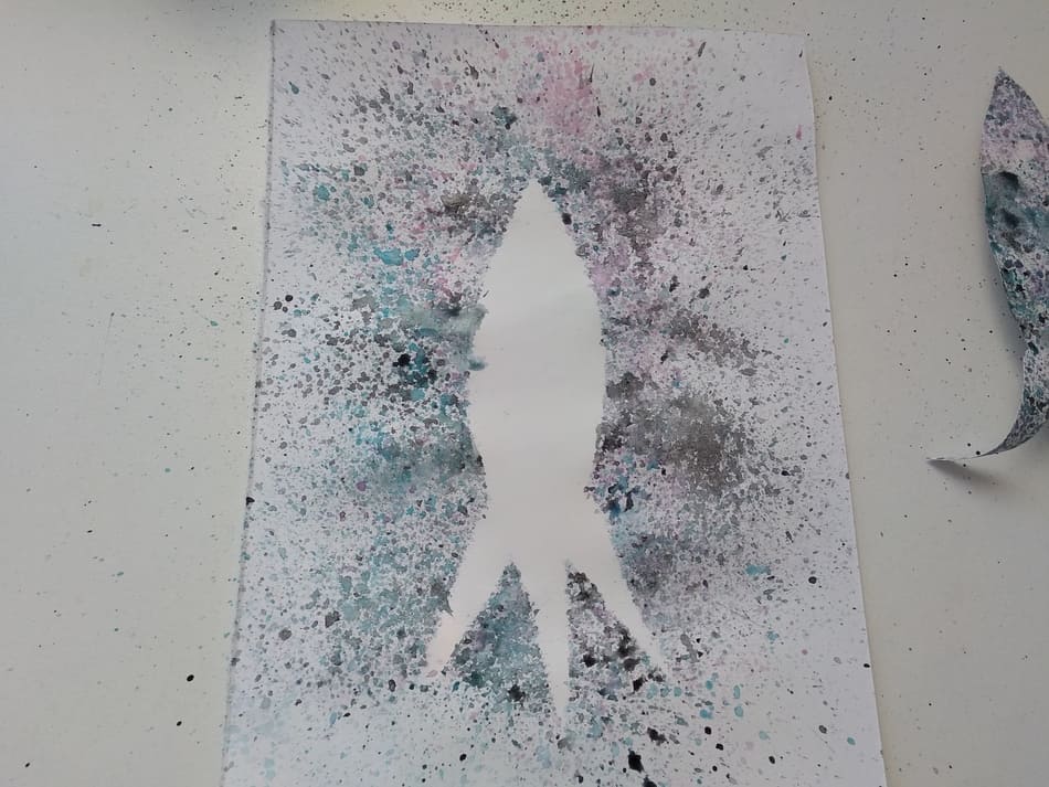 Теперь нужно дождаться высыхания краски. Используйте заостренный предмет, чтобы нарисовать космические объекты на бумаге, чтобы раскрыть цветные карандаши.