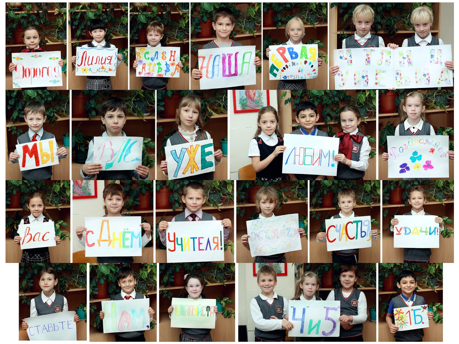 Газета «С днем рождения, учитель» должна иметь эстетический смысл. Главное правило, которое следует соблюдать во все времена, не нужно указывать возраста преподавателя. Придумайте яркую подпись и красивое пожелание, которое вы подарите от всего класса уважаемому преподавателю. Оригинальной идеей для поздравления будет составление коллажа с табличками в руках детей. На каждой табличке (листе бумаги) должно быть напечатано пожелание. Пример на фото ниже.